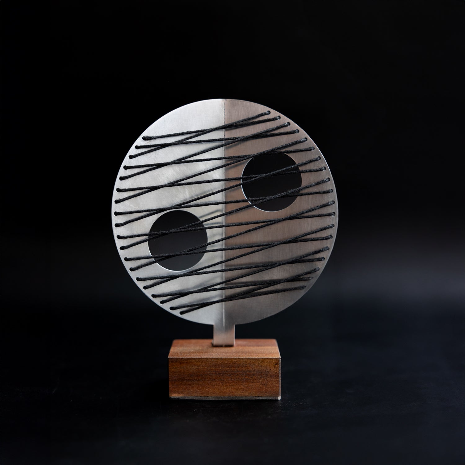 Striking wooden ornament on a stone base inspired by the abstract forms of Barbara Hepworth's work.