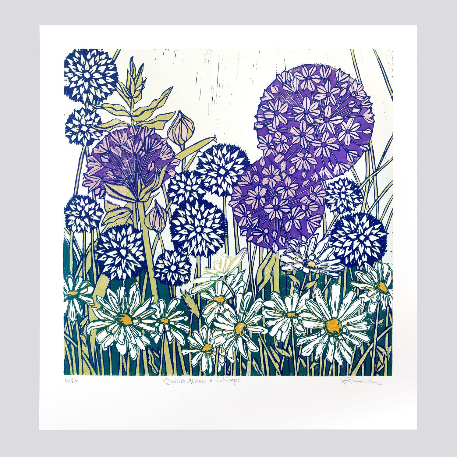 Observational sketching is the starting point for Knowles’ prints. Each design is carefully thought out and planned, usually the result of several drawings of the same subject. She then carves a lino block, printing different colours at different stages of carving to create the finished print.